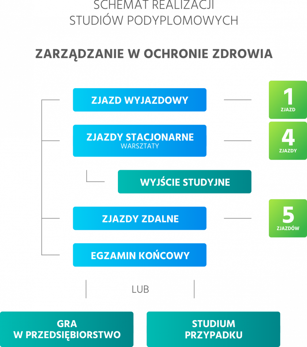 GRA W PRZEDSIĘBIORSTWO (wirtualny zakład opieki zdrowotnej) – jako nowoczesna forma dydaktyki szkoły wyższej polegać będzie na rozwiązaniu przez słuchaczy zadania typu „case study”, związanego z funkcjonowaniem zakładu opieki zdrowotnej z wykorzystaniem nowoczesnych narzędzi IT. Uczestnicy gry będą podejmowali szereg decyzji związanych z prowadzeniem wirtualnego zakładu opieki zdrowotnej, podobnych do tych, które muszą podejmować menedżerowie jednostek ZOZ działających w rzeczywistości. Wyjątkowym walorem tej formy zaliczenia jest realizm sytuacji i konieczność zespołowego podejmowania strategicznych decyzji, które na ostatecznej prezentacji umożliwią komisji ocenę wiedzy i umiejętności z zakresu zarządzania podmiotami leczniczymi zdobytych podczas nauki na studiach podyplomowych.